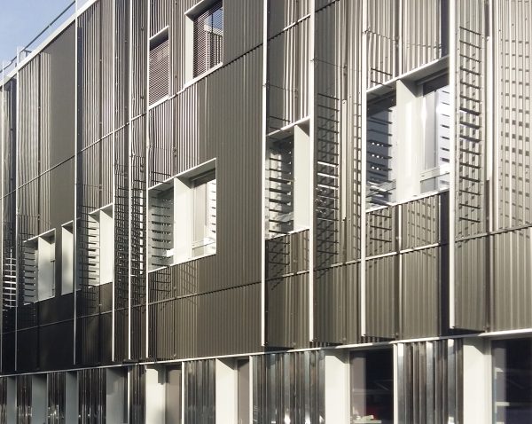 L’architecture du bâtiment se veut être d’une grande sobriété, par une rigueur du dessin des ouvertures et par la mise en place d’un simple bardage vertical anthracite rehaussés de quelques aplats de bardage et d’ailettes inox. De petites perforations au niveau des fenêtres viennent faire vibrer les façades. Un bardage de type Trespa vient marquer les entrées et son bleu nuit reprend les teintes du logo d’ITGA. En rez-de-chaussée, un béton lasuré anthracite marque le soubassement.
