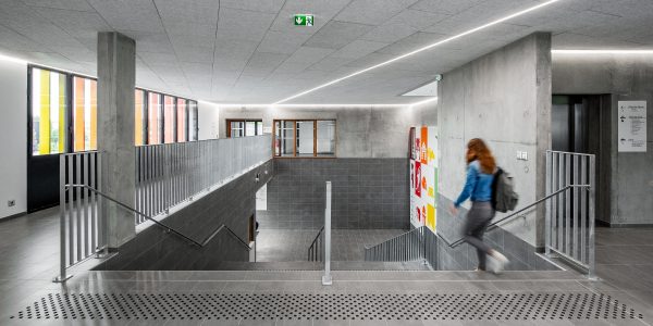 L’implantation du bâtiment principal permet un accès unique pour tous les élèves au hall d’entrée. Il s’affranchie d’une rampe accessible aux personnes à mobilité réduite et limite le long trajet qui sépare le plateau des cars à la parcelle du collège. Cette différence d’altimétrie offre un hall d’entrée développé sur trois niveaux qui articule des couloirs flanqués de salles de classe des deux côtés, schémas le plus efficace tant du point de vue économique qu’organisationnel. La suppression d’une ou plusieurs salles courantes permet la création de loggias qui viennent compléter l’apport de lumière avec des vues cadrées sur le paysage.