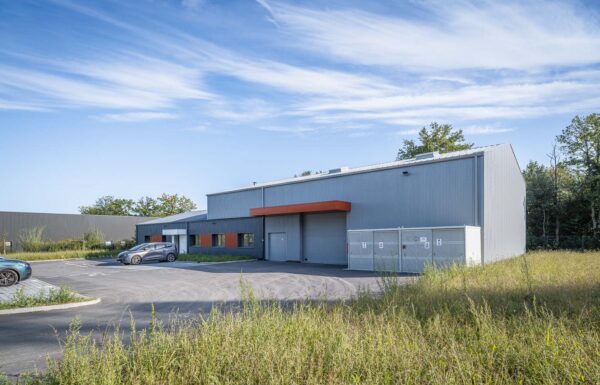 En effet, l’ensemble du bâtiment est habillé de bardage métallique de type sinus, en pose verticale, mais du fait de ses différentes teintes et de ses 2 hauteurs de faitage, il créé ainsi l’illusion de 2 entités, imbriquées l’une dans l’autre.
