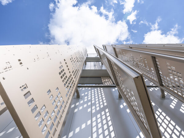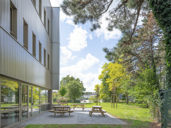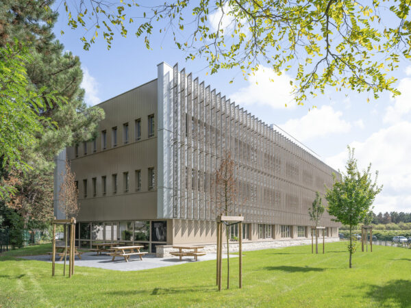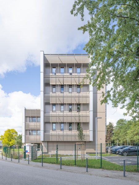 Avec son écriture lisible et ses teintes sobres, ce projet à une esthétique intemporelle. Il est composé de deux volumes principaux imbriqués dans la longueur. Le premier volume en front de rue est plus bas et marqué par des brise-soleils verticaux. La perforation des brise-soleils permet de jouer avec les points de vue et de faire « vibrer » la façade. Le deuxième volume se positionne volontairement en retrait. Son écriture architecturale est épurée et élégante. Il forme une silhouette claire et verticale qui va chercher de la hauteur et étirer le bâtiment.