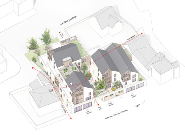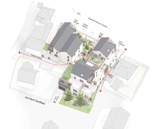 Notre réflexion s’est portée sur les circulations communes et les possibles connexions à tisser avec les cheminements existants. Des circulations rejoignent la venelle au sud, la place des droits de l’homme et le chemin au Nord et convergent vers un ilot central, végétalisé et aménagé. L’accès automobile au parking souterrain se fait depuis la rue Henri Queffelec, ce qui permet de libérer la place des droits de l’homme de toute circulation automobile en lien avec le projet.
