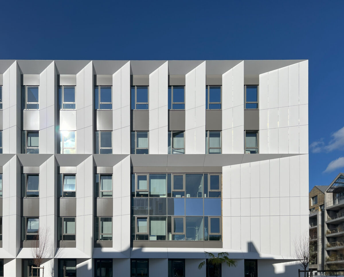 – Les habitations : squelette béton, façades ossature bois + bardage bois, balcons rapportés pour garantir une enveloppe thermique optimale, toitures zinc.