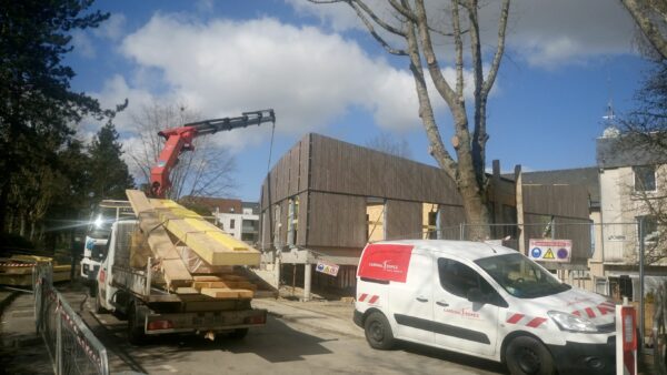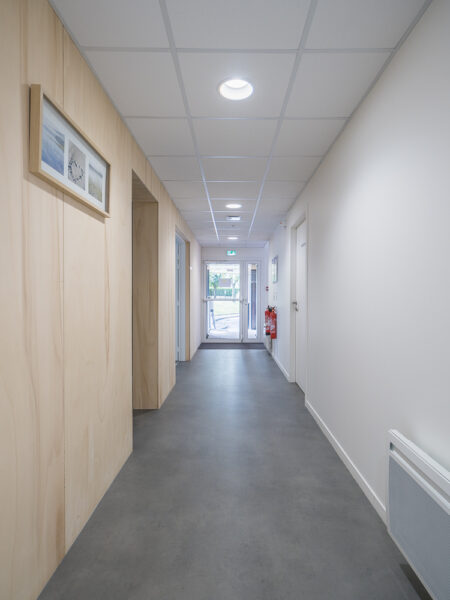 Ce bâtiment reprend l’écrite architecturale de la dernière extension de la Mairie, bardage bois , même tailles de baies , même teintes. Une casquette Alu thermolaquée , ton « or », liaisonne ces 2 volumes et marque ainsi l’entrée du pôle social.